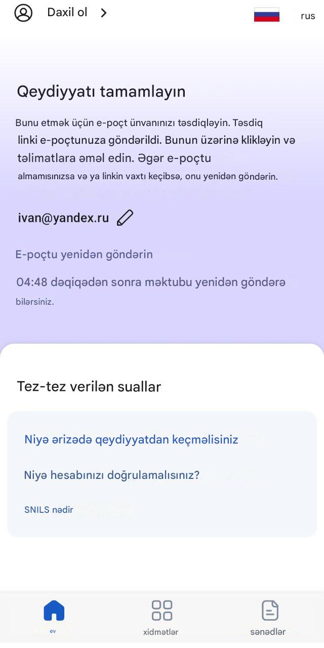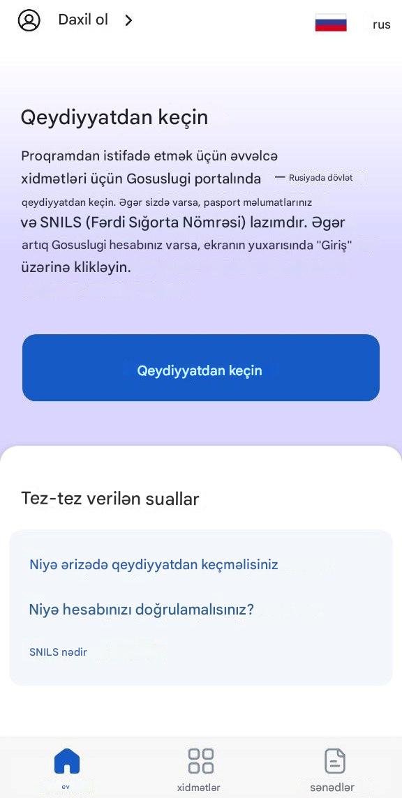 ⚠️ Qeyd: Əgər artıq Gosuslugi hesabınız varsa, amma şifrəni xatırlamırsınızsa və RuID-də yeni istifadəçi kimi qeydiyyatdan keçməyə çalışsanız, problemlər yarana bilər. Tətbiq hesabınızı SNILS və ya e-poçt vasitəsilə müəyyən edəcək. Qeydiyyatı başa çatdırmaq üçün başqa məlumat daxil etməli və ya şifrəni bərpa etməlisiniz.
