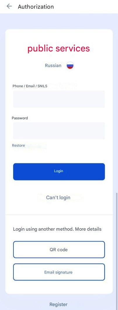 Log in through “Gosuslugi” or click “Register” if you do not have a Gosuslugi account.