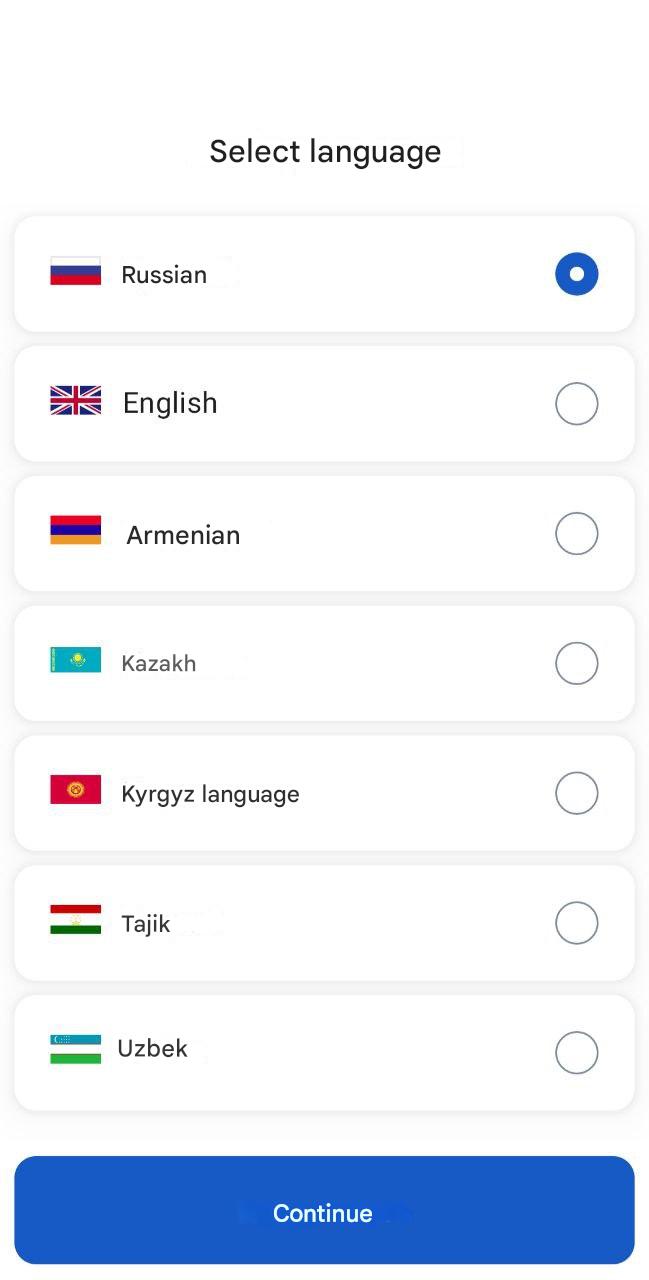 Open the app and select your preferred interface language. Options include English, Armenian, Kazakh, Kyrgyz, Russian, Tajik, or Uzbek.