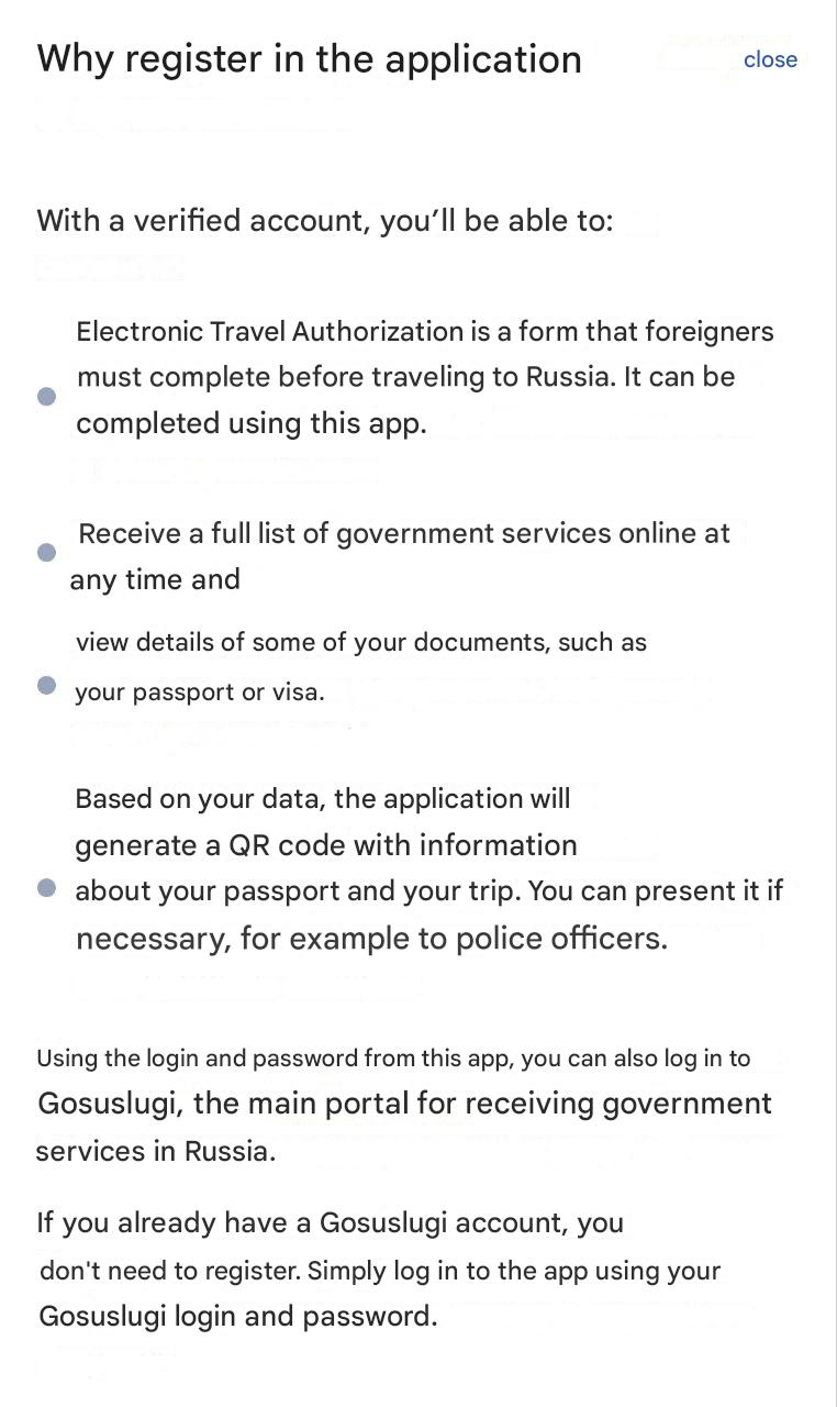 After completing registration, you will have a digital profile as a foreign citizen. With it, you can submit entry applications to Russia (at least 72 hours before crossing the border), check for entry restrictions, and access government services online.