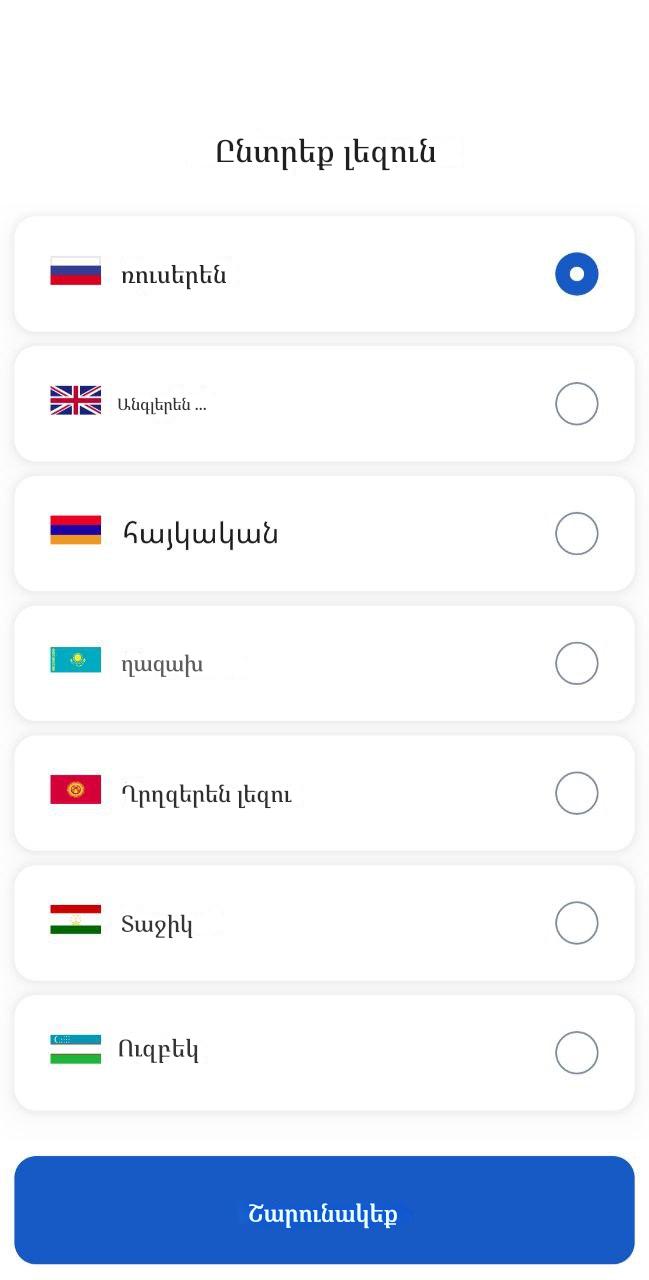 Բացեք հավելվածը և ընտրեք ձեզ հարմար ինտերֆեյսի լեզուն։ Հասանելի են՝ անգլերեն, հայերեն, ղազախերեն, ղրղզերեն, ռուսերեն, տաջիկերեն կամ ուզբեկերեն։