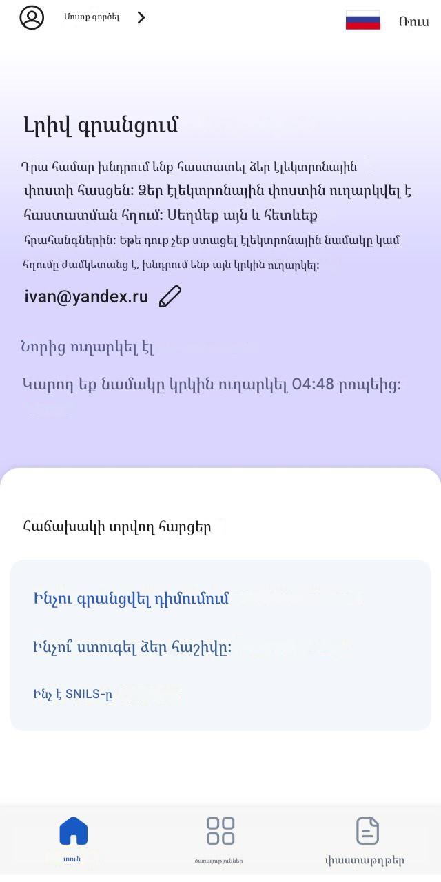 ⚠️ Նշում․ Եթե արդեն ունեք Gosuslugi հաշիվ, բայց մոռացել եք գաղտնաբառը և փորձեք գրանցվել RuID-ում որպես նոր օգտվող, կարող են խնդիրներ առաջանալ։ Հավելվածը կճանաչի ձեր հաշիվը SNILS-ի կամ էլ․ փոստի միջոցով։ Գրանցումը ավարտելու համար պետք է մուտքագրեք այլ տվյալներ կամ վերականգնեք գաղտնաբառը։