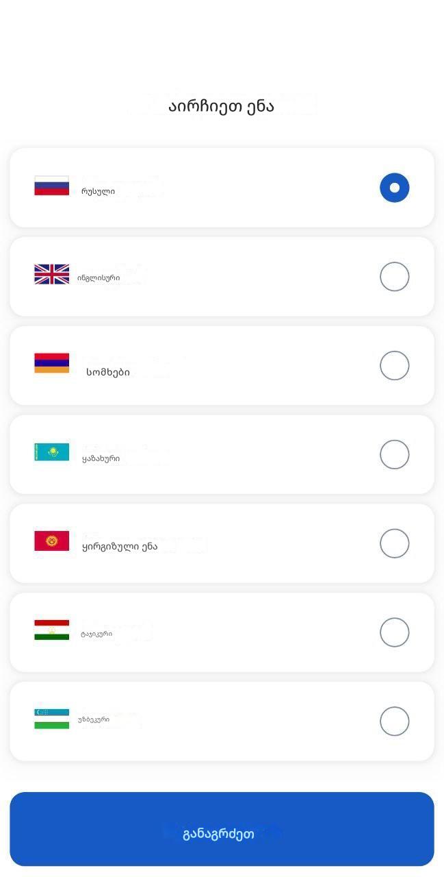გახსენით აპი და აირჩიეთ თქვენთვის სასურველი ინტერფეისის ენა. ხელმისაწვდომია ინგლისური, სომხური, ყაზახური, ყირგიზული, რუსული, ტაჯიკური და უზბეკური.