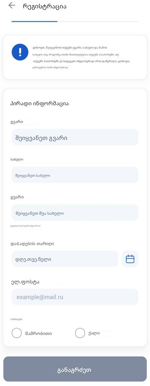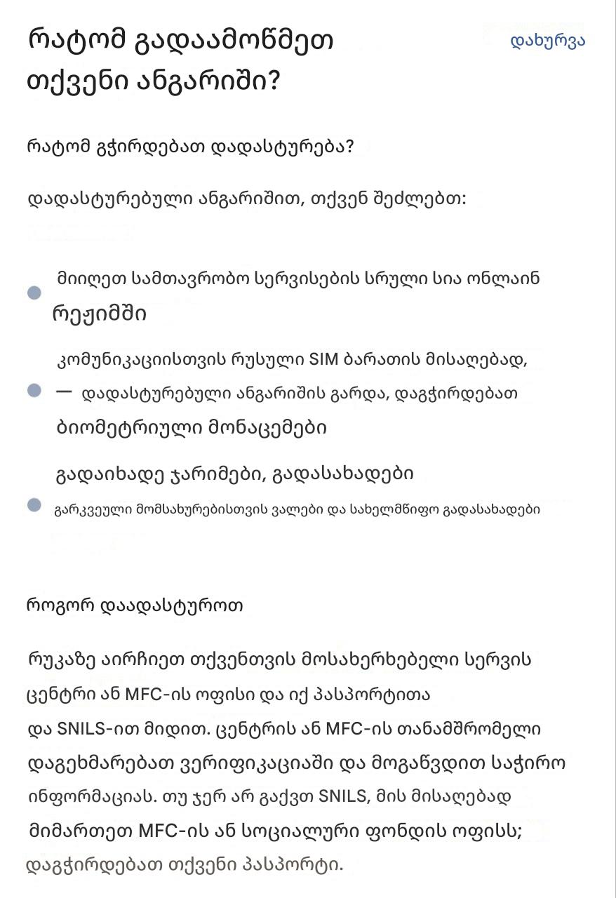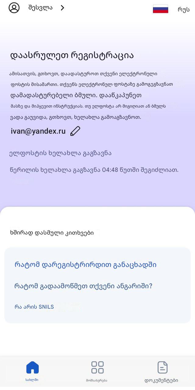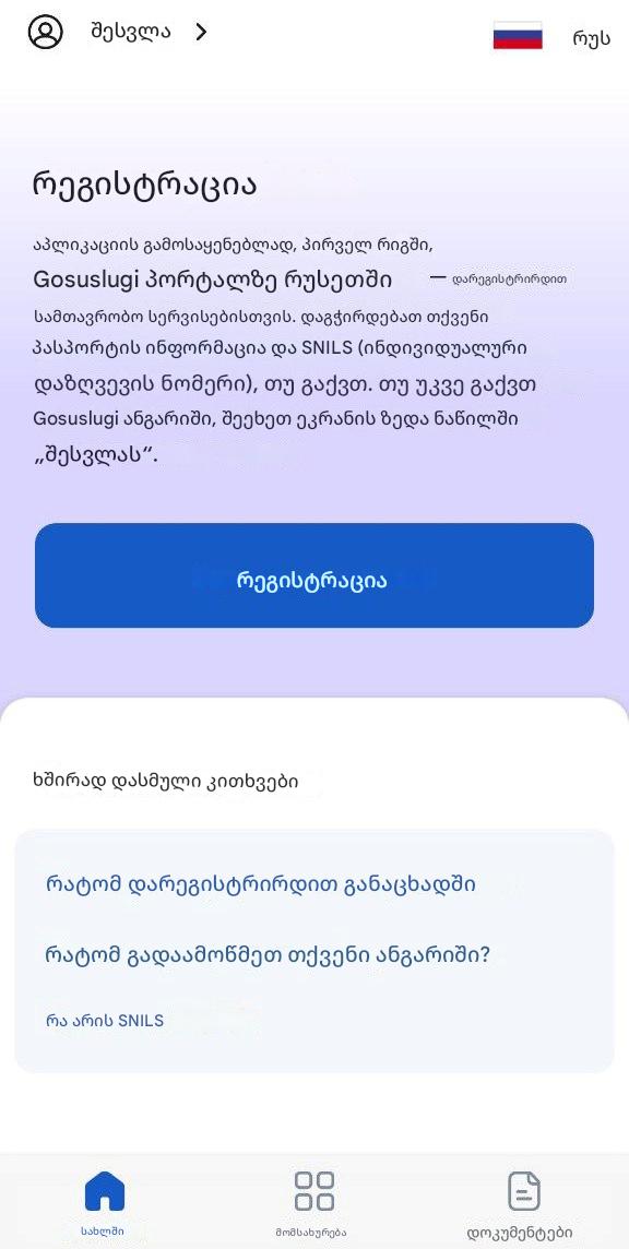 ⚠️ შენიშვნა: თუ უკვე გაქვთ Gosuslugi ანგარიში, მაგრამ პაროლი არ გახსოვთ და ცდილობთ RuID-ში ახალ მომხმარებლად დარეგისტრირებას, შეიძლება პრობლემები წარმოიშვას. აპი აღმოაჩენს თქვენს ანგარიშს SNILS-ის ან ელფოსტის საშუალებით. რეგისტრაციის დასასრულებლად დაგჭირდებათ სხვა მონაცემების შეტანა ან პაროლის აღდგენა.