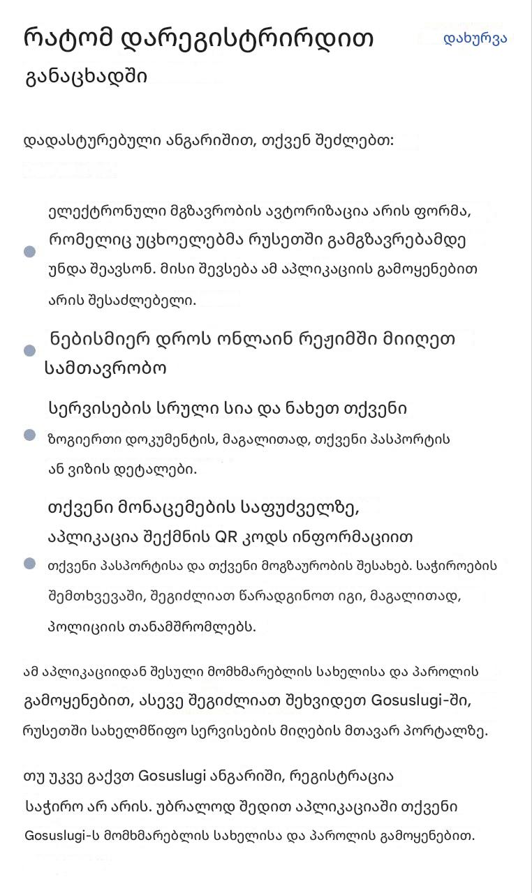 რეგისტრაცია საჭიროა თქვენი დოკუმენტებზე სწრაფი წვდომისთვის, სახელმწიფო სერვისების მისაღებად, მოგზაურობის ელექტრონული ავტორიზაციისთვის და სახელმწიფოსთვის თქვენი ვინაობისა და ვიზიტის მიზნის უსაფრთხო და სწრაფი გადამოწმებისთვის. QR-კოდის გარეშე საზღვრის გადაკვეთა შეუძლებელი იქნება.