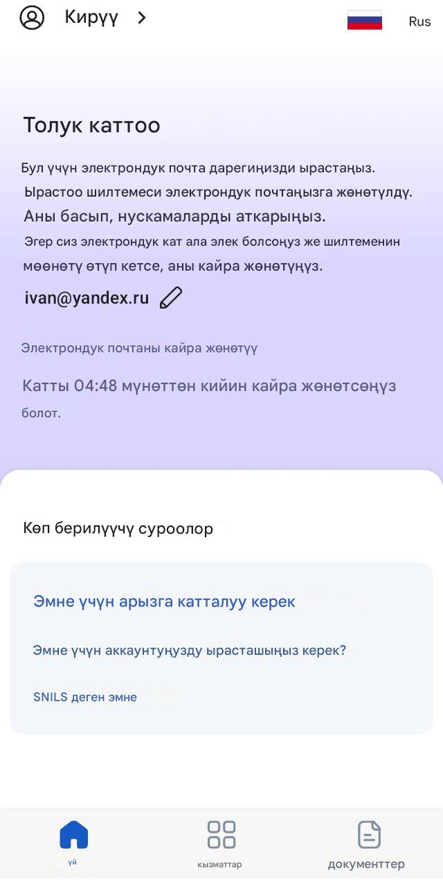 ⚠️ Эскертүү: Эгерде сизде буга чейин Gosuslugi аккаунту болуп, сырсөздү унутуп калсаңыз жана RuIDде жаңы колдонуучу катары катталууга аракет кылсаңыз, көйгөйлөр болушу мүмкүн. Колдонмо аккаунту СНИЛС же электрондук почта аркылуу аныктайт. Каттоону бүтүрүү үчүн башка маалымат киргизүү же сырсөздү калыбына келтирүү зарыл болот.